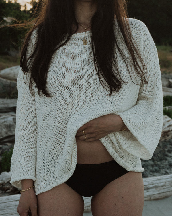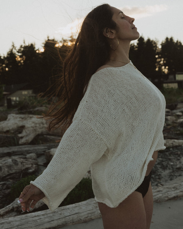 Hand knit linen blend sweater in Creamy White 50% linen 50% cotton One Size Approximate measurements 50” around body, 22-23” length from shoulder seam. Drop sleeve. Care - hand wash/dry flat Made and ready to ship within 3 business...